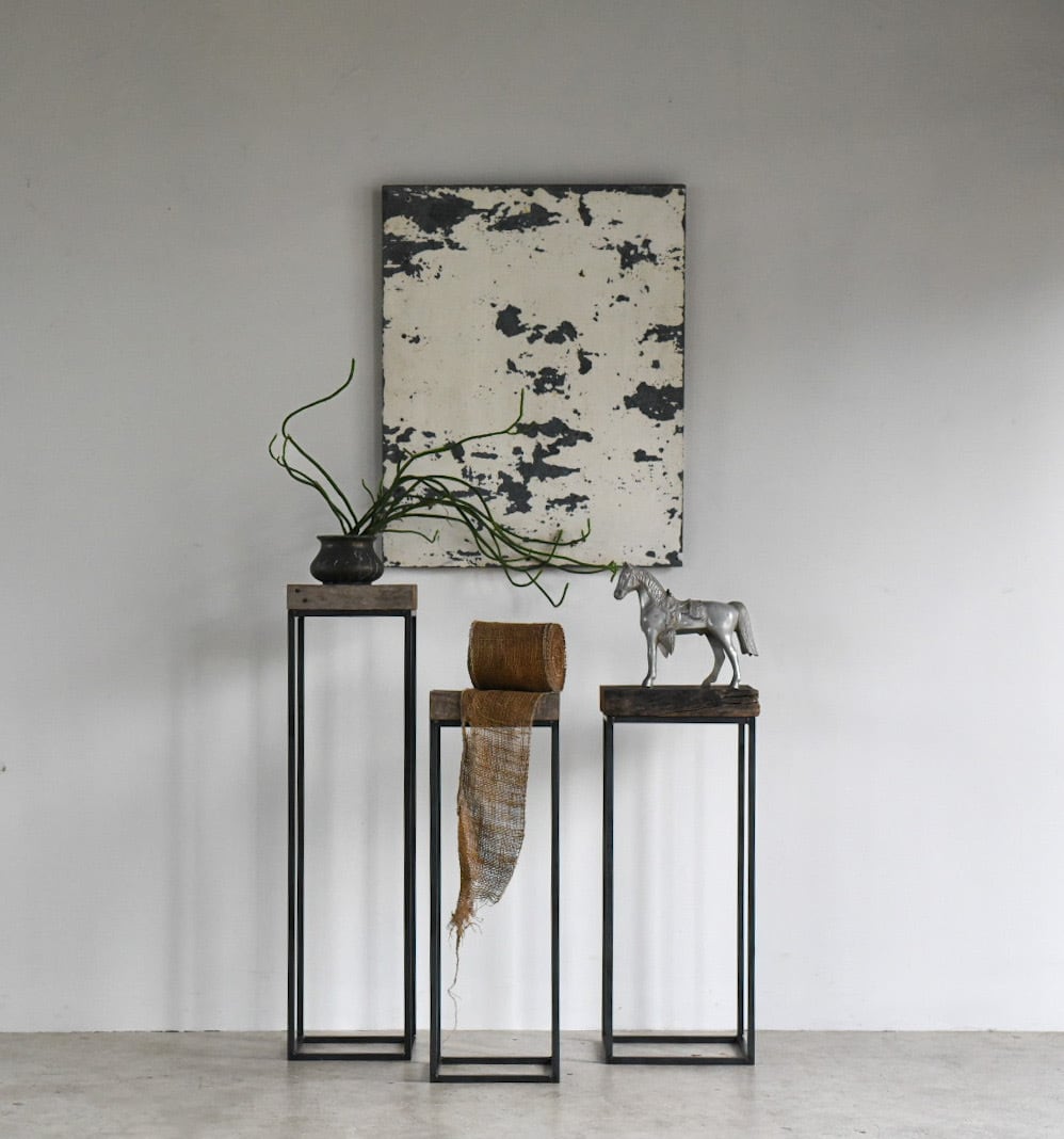 沖縄の太陽と雨風にさらされて経年変化した木材と、鉄の角鋼を1点1点溶接して仕上げたフレームをディスプレイ台に仕立てました. Indigo | Dispray Stand 高さH890 横幅W235 奥行D197 板厚45 /mm 素材|アピトン材、スチール鋼 送料| ゆうパック170サイズ ※木部は経年で刻まれた素材感を生かして製作しておりますため1点1点表情が異なります. ※スチール部分は手溶接で1点1点仕上げております.溶接部の色味の違いや細かなキズや擦れ等もございます. ※発送の梱包材は再利用した資材を使用することがございます.環境に配慮した対応になりますことご了承下さいませ.