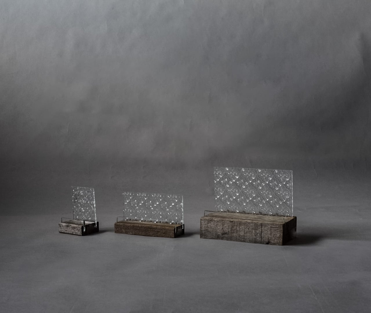 古民家で使われていた窓ガラスと古材で仕立てたスタンドです.