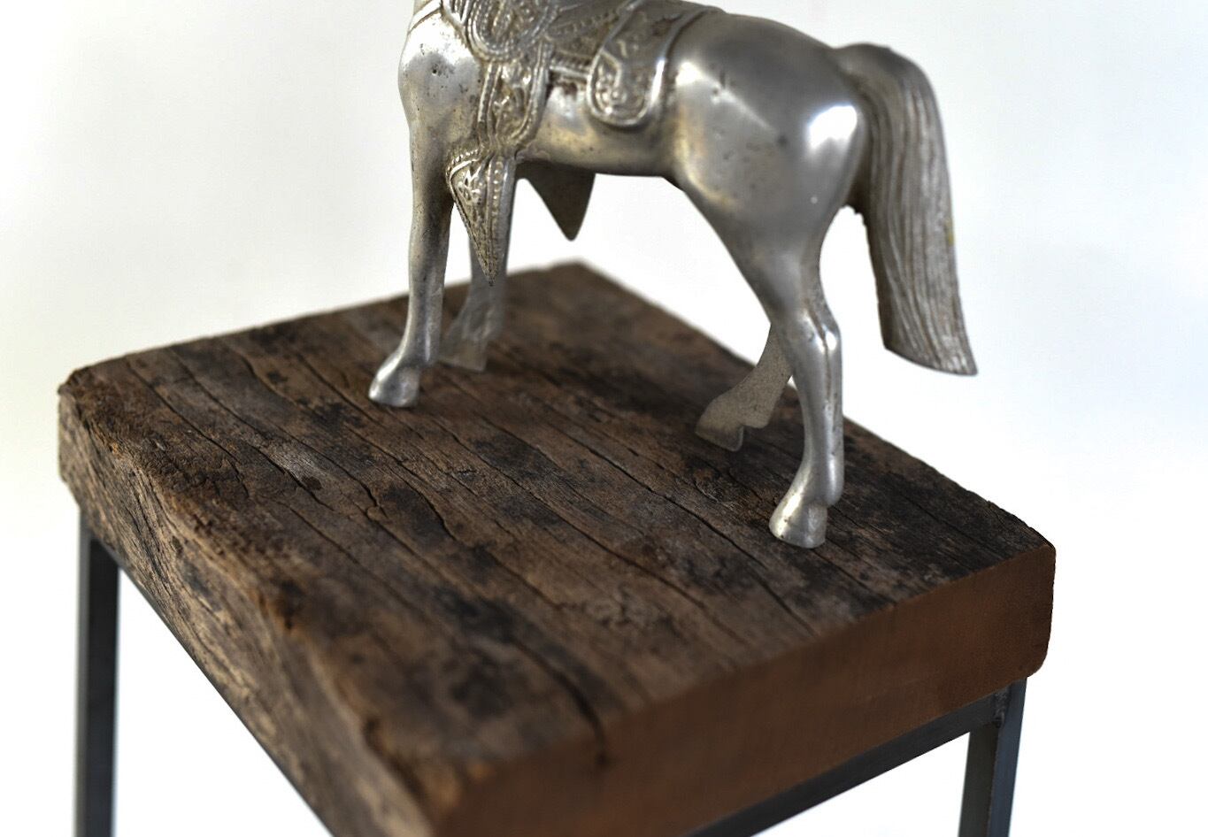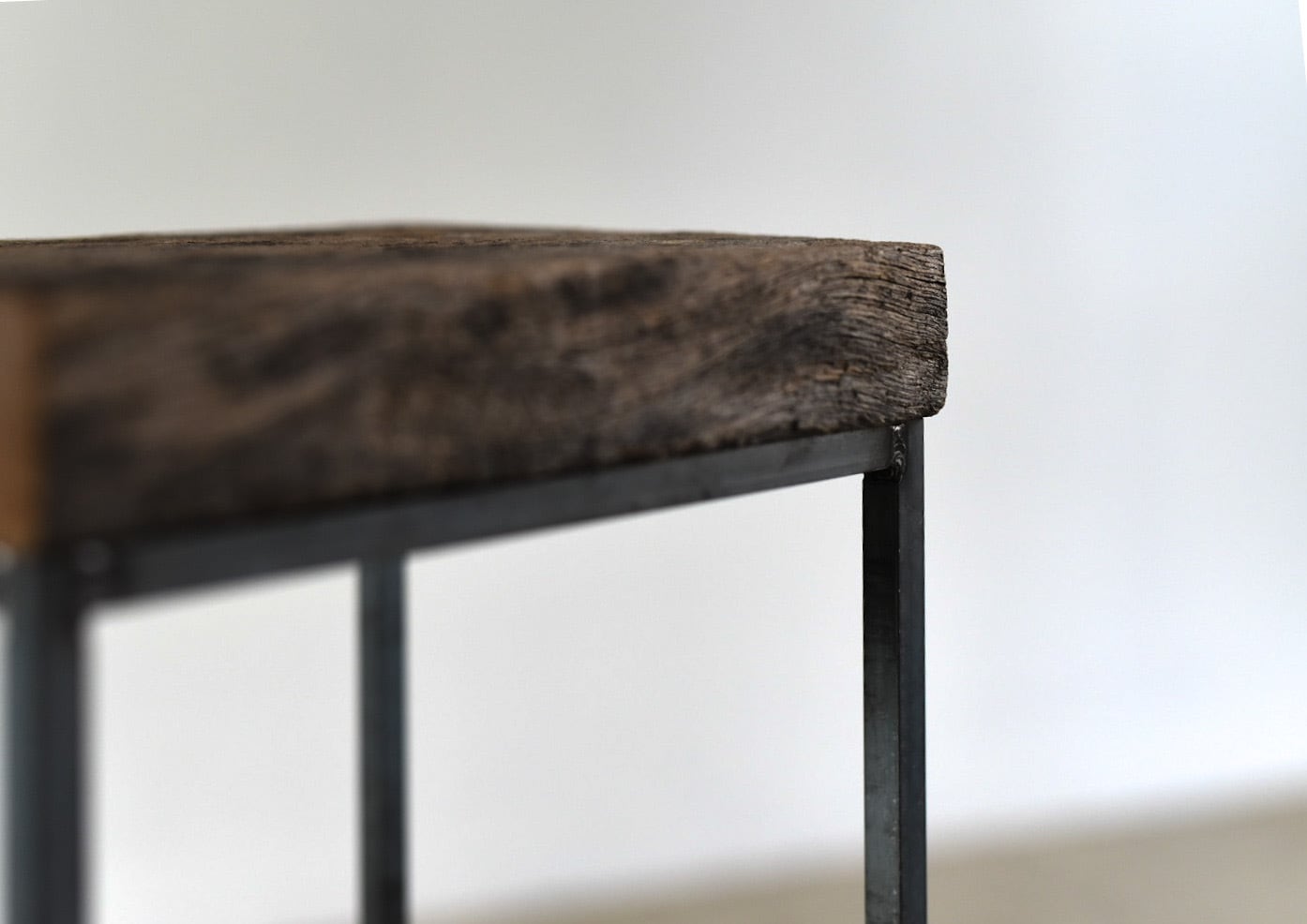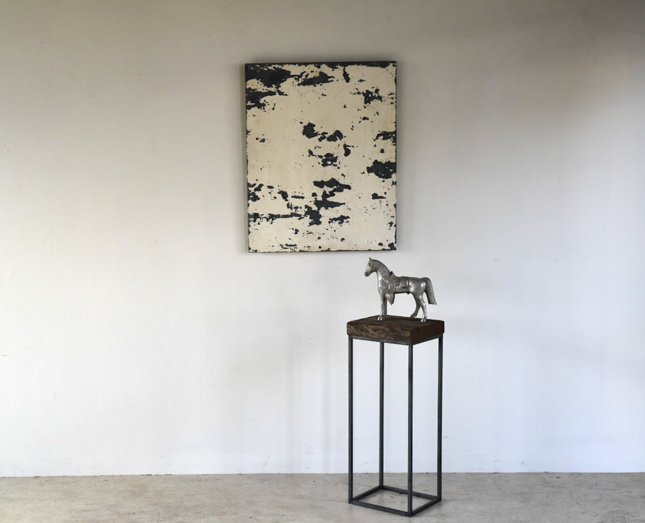 沖縄の太陽と雨風にさらされて経年変化した木材と、鉄の角鋼を1点1点溶接して仕上げたフレームをディスプレイ台に仕立てました.