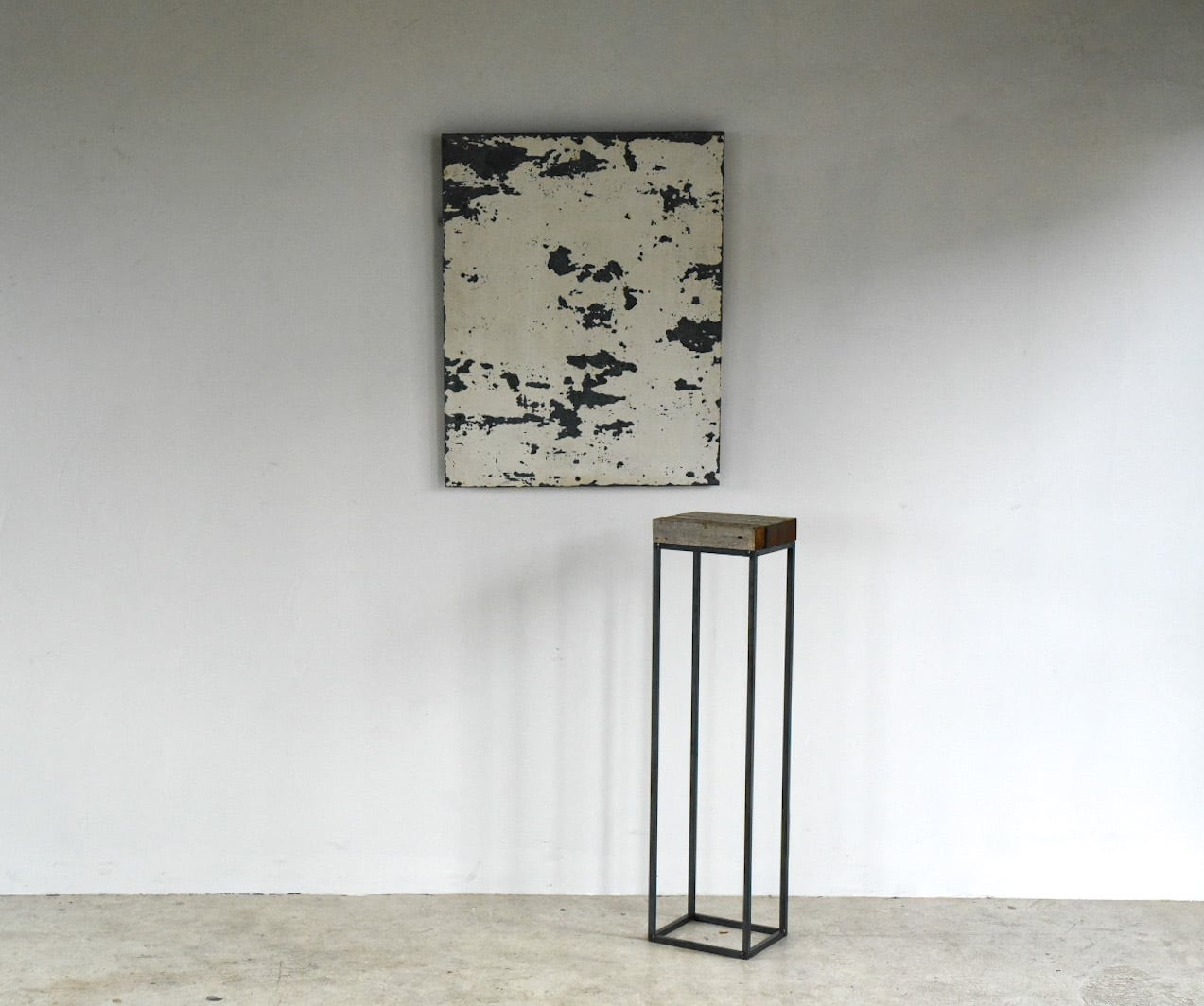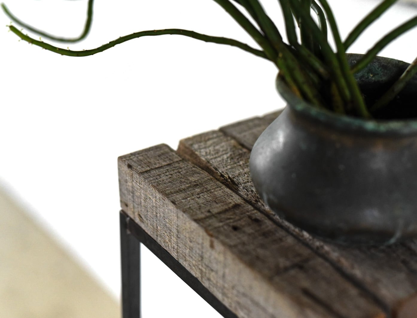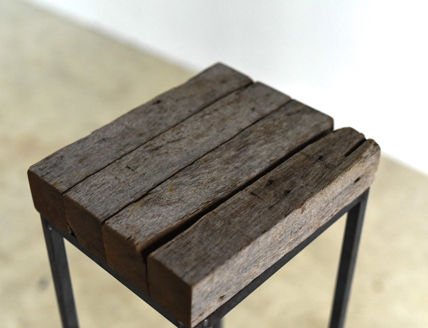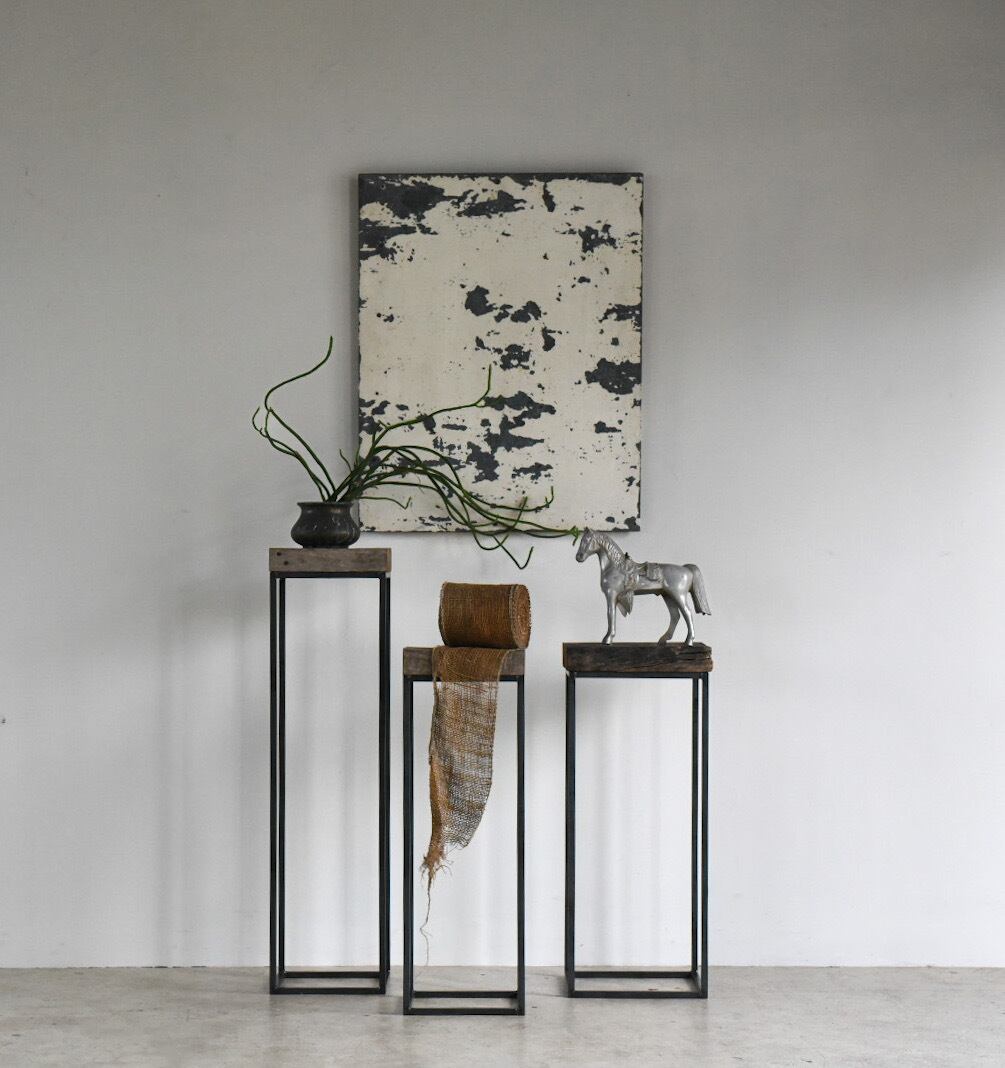沖縄の太陽と雨風にさらされて経年変化した木材と、鉄の角鋼を1点1点溶接して仕上げたフレームをディスプレイ台に仕立てました.