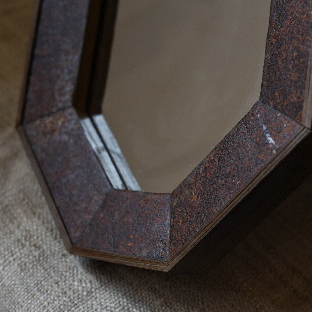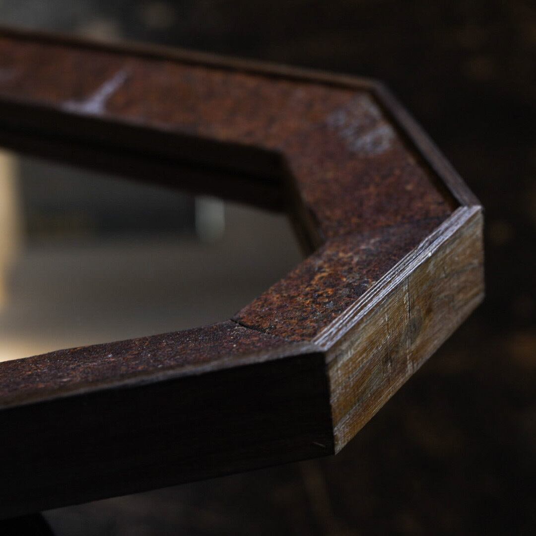 太陽と雨風にさらされ、ゆっくりと育まれた経年の景色を切り取り、鏡のフレームへと再構築しました。