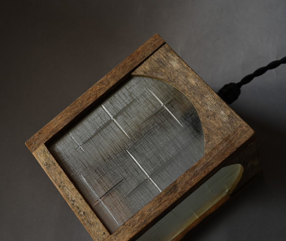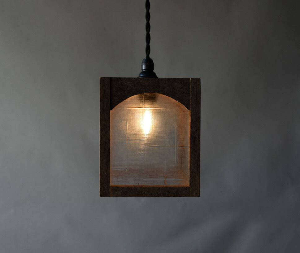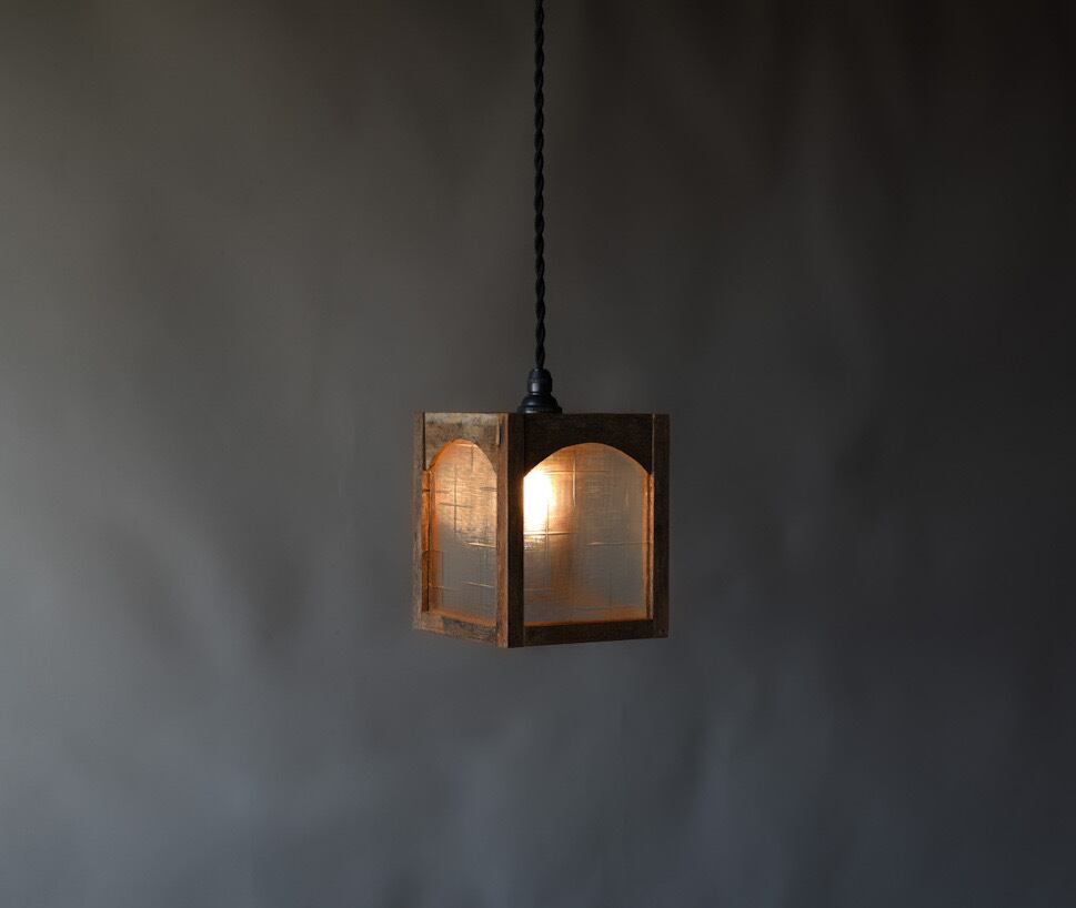 Indigoの灯りの定番となっている、古材と磨りガラスで作ったペンダントライト.